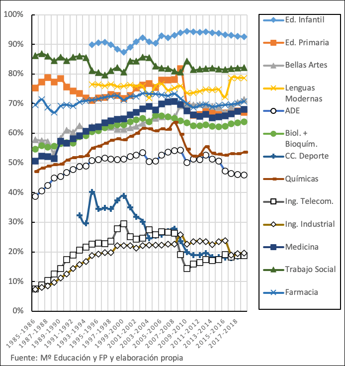 Tasa de mujeres en distintos estudios universitarios 1985-2018