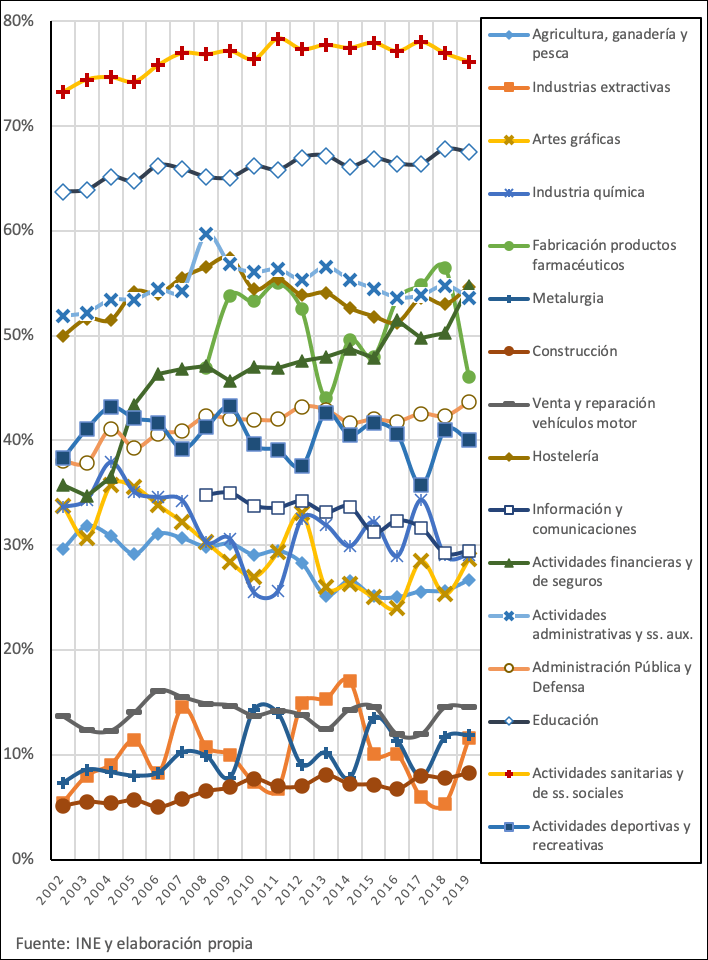 Tasa de mujeres en distintas actividades laborales 2002-2019